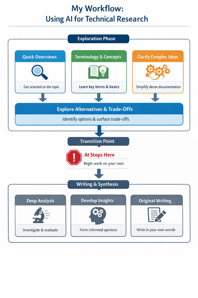 AI enters my workflow at the beginning, during the exploration phase, and exits before I start synthesizing information or writing anything. That’s the boundary that keeps my work original and grounded in real understanding.